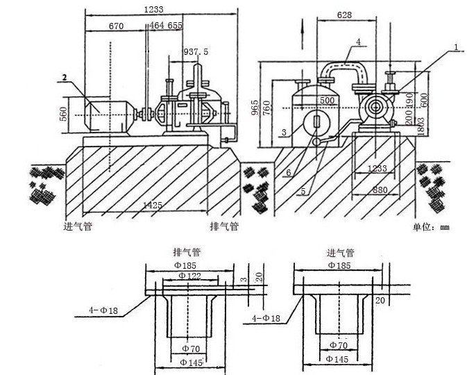 (5)使側蓋上的進氣管和管子(10)脫開并松開示體與側蓋(2)的連接螺釘和泵腳處的雙頭螺栓。在泵體下加墊,然后使側蓋和泵體離開,從軸上取下側蓋(側蓋取下后應將軸支住)。